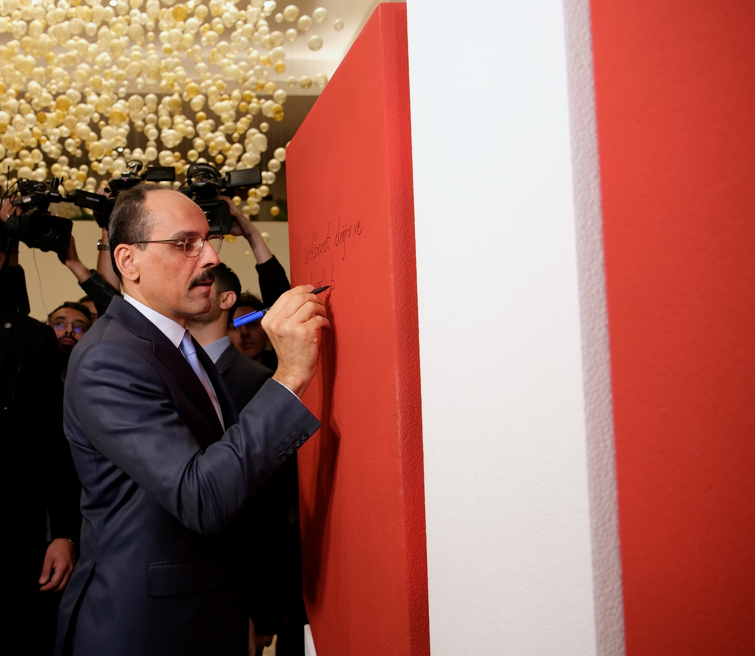 Açılış konuşmalarının ardından İbrahim Kalın, etkinliğin yapıldığı salondaki hatıra panosuna "İstihbarat doğru ve kıymetli bilgidir" notunu yazdı.